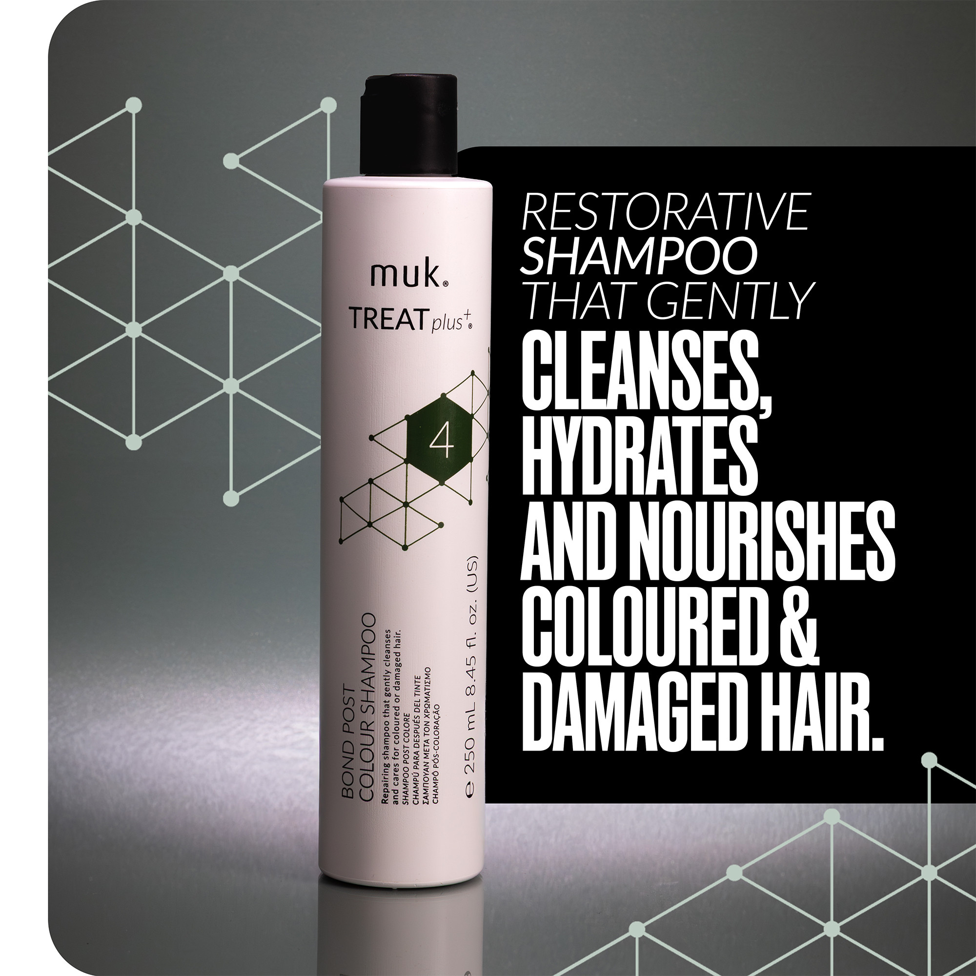 The muk Treat Plus + Bond Post Colour Shampoo is designed to strengthen, repair, and restore hair integrity from within. This dvanced formula combines cleansing surfactants with protein complexes, amino acids and moisture-binding ingredients that fortify damaged bonds and enhance hair resilience. It helps reverse the effects of chemical, thermal, and environmental stress while maintaining softness, shine, and elasticity.​